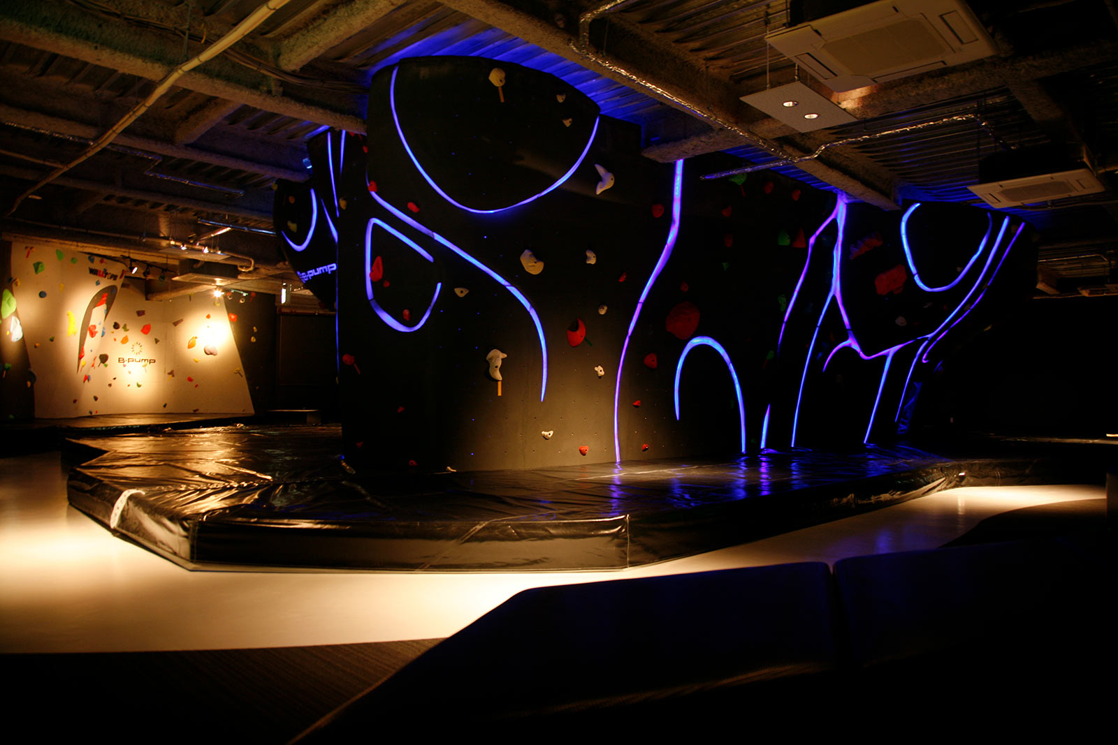 B-Pump Tokyo Akihabara 有一个独特的“太空墙”,这是一堵陡峭的悬垂墙,即使是最有经验的岩者也能挑战。这堵墙的设计模仿了户外攀岩区的地形,并具有多种支撑点和功能来测试您的技能。